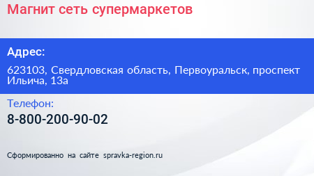 Магнит, сеть супермаркетов по адресу 623103, Свердловская область, Первоуральск, проспект Ильича, 13а в дальнейшем Организация, размещена в следующих категориях: