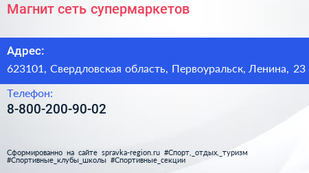 Магнит, сеть супермаркетов по адресу 623101, Свердловская область, Первоуральск, Ленина, 23 в дальнейшем Организация, размещена в следующих категориях: