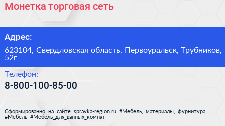 Монетка, торговая сеть по адресу 623104, Свердловская область, Первоуральск, Трубников, 52г в дальнейшем Организация, размещена в следующих категориях:
