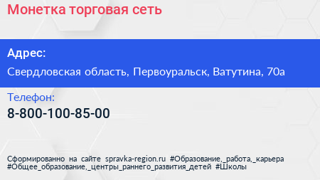 Монетка, торговая сеть по адресу Свердловская область, Первоуральск, Ватутина, 70а в дальнейшем Организация, размещена в следующих категориях: