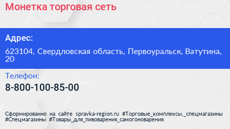 Монетка, торговая сеть по адресу 623104, Свердловская область, Первоуральск, Ватутина, 20 в дальнейшем Организация, размещена в следующих категориях: