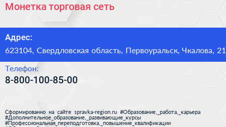 Монетка, торговая сеть по адресу 623104, Свердловская область, Первоуральск, Чкалова, 21 в дальнейшем Организация, размещена в следующих категориях: