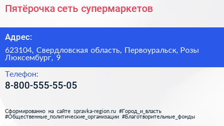 Пятёрочка, сеть супермаркетов по адресу 623104, Свердловская область, Первоуральск, Розы Люксембург, 9 в дальнейшем Организация, размещена в следующих категориях: