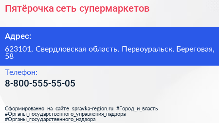 Пятёрочка, сеть супермаркетов по адресу 623101, Свердловская область, Первоуральск, Береговая, 58 в дальнейшем Организация, размещена в следующих категориях: