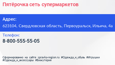 Пятёрочка, сеть супермаркетов по адресу 623104, Свердловская область, Первоуральск, Ильича, 4а в дальнейшем Организация, размещена в следующих категориях: