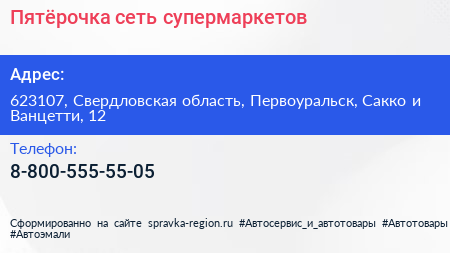 Пятёрочка, сеть супермаркетов по адресу 623107, Свердловская область, Первоуральск, Сакко и Ванцетти, 12 в дальнейшем Организация, размещена в следующих категориях: