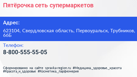 Пятёрочка, сеть супермаркетов по адресу 623104, Свердловская область, Первоуральск, Трубников, 66Б в дальнейшем Организация, размещена в следующих категориях: