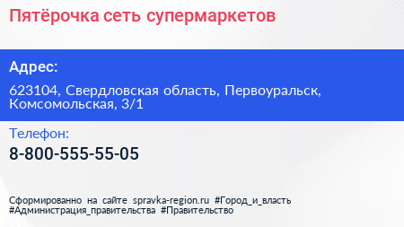 Пятёрочка, сеть супермаркетов по адресу 623104, Свердловская область, Первоуральск, Комсомольская, 3/1 в дальнейшем Организация, размещена в следующих категориях: