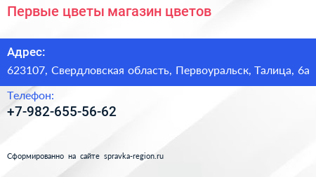 Первые цветы, магазин цветов по адресу 623107, Свердловская область, Первоуральск, Талица, 6а в дальнейшем Организация, размещена в следующих категориях:
