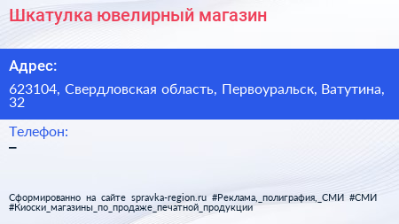 Шкатулка, ювелирный магазин по адресу 623104, Свердловская область, Первоуральск, Ватутина, 32 в дальнейшем Организация, размещена в следующих категориях: