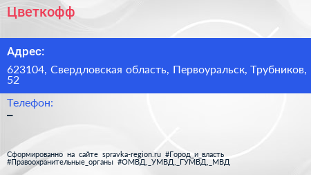 Цветкофф по адресу 623104, Свердловская область, Первоуральск, Трубников, 52 в дальнейшем Организация, размещена в следующих категориях: