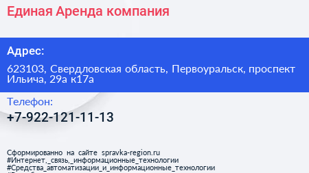 Единая Аренда, компания по адресу 623103, Свердловская область, Первоуральск, проспект Ильича, 29а к17а в дальнейшем Организация, размещена в следующих категориях: