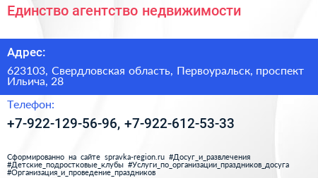 Единство, агентство недвижимости по адресу 623103, Свердловская область, Первоуральск, проспект Ильича, 28 в дальнейшем Организация, размещена в следующих категориях: