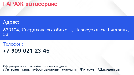 ГАРАЖ, автосервис по адресу 623104, Свердловская область, Первоуральск, Гагарина, 53 в дальнейшем Организация, размещена в следующих категориях: