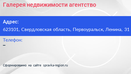 Галерея недвижимости, агентство по адресу 623101, Свердловская область, Первоуральск, Ленина, 31 в дальнейшем Организация, размещена в следующих категориях: