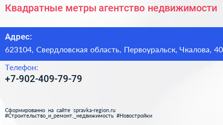 Квадратные метры, агентство недвижимости по адресу 623104, Свердловская область, Первоуральск, Чкалова, 40 в дальнейшем Организация, размещена в следующих категориях: