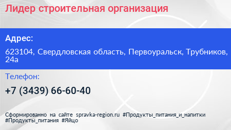 Лидер, строительная организация по адресу 623104, Свердловская область, Первоуральск, Трубников, 24а в дальнейшем Организация, размещена в следующих категориях: