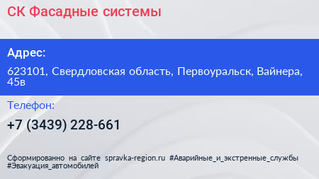 СК Фасадные системы по адресу 623101, Свердловская область, Первоуральск, Вайнера, 45в в дальнейшем Организация, размещена в следующих категориях: