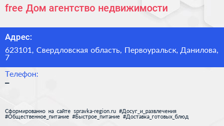 free Дом, агентство недвижимости по адресу 623101, Свердловская область, Первоуральск, Данилова, 7 в дальнейшем Организация, размещена в следующих категориях: