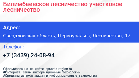 Билимбаевское лесничество, участковое лесничество по адресу Свердловская область, Первоуральск, Лесничество, 17 в дальнейшем Организация, размещена в следующих категориях: