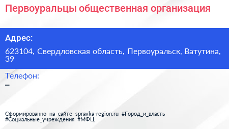 Первоуральцы, общественная организация по адресу 623104, Свердловская область, Первоуральск, Ватутина, 39 в дальнейшем Организация, размещена в следующих категориях: