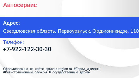 Автосервис по адресу Свердловская область, Первоуральск, Орджоникидзе, 110 в дальнейшем Организация, размещена в следующих категориях: