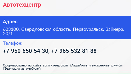 Автотехцентр по адресу 623100, Свердловская область, Первоуральск, Вайнера, 20/1 в дальнейшем Организация, размещена в следующих категориях: