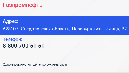 Газпромнефть по адресу 623107, Свердловская область, Первоуральск, Талица, 97 в дальнейшем Организация, размещена в следующих категориях: