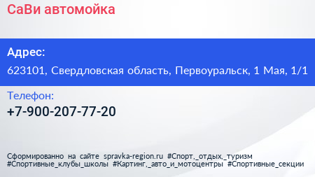 СаВи, автомойка по адресу 623101, Свердловская область, Первоуральск, 1 Мая, 1/1 в дальнейшем Организация, размещена в следующих категориях: