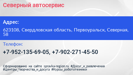 Северный, автосервис по адресу 623108, Свердловская область, Первоуральск, Северная, 58 в дальнейшем Организация, размещена в следующих категориях: