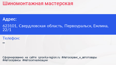 Шиномонтажная мастерская по адресу 623101, Свердловская область, Первоуральск, Емлина, 22/1 в дальнейшем Организация, размещена в следующих категориях: