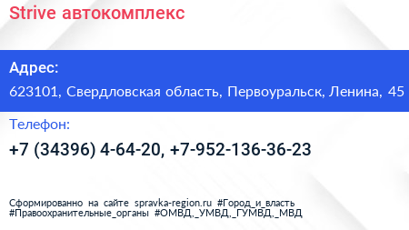 Strive, автокомплекс по адресу 623101, Свердловская область, Первоуральск, Ленина, 45 в дальнейшем Организация, размещена в следующих категориях: