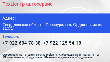 ТехЦентр, автосервис по адресу Свердловская область, Первоуральск, Орджоникидзе, 110/1 в дальнейшем Организация, размещена в следующих категориях: