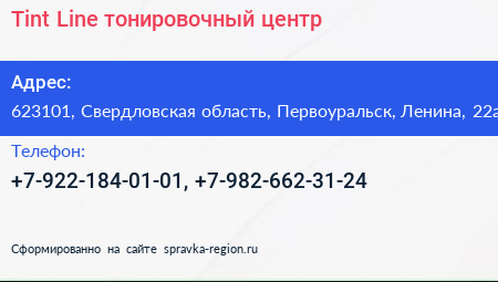Tint-Line, тонировочный центр по адресу 623101, Свердловская область, Первоуральск, Ленина, 22а в дальнейшем Организация, размещена в следующих категориях: