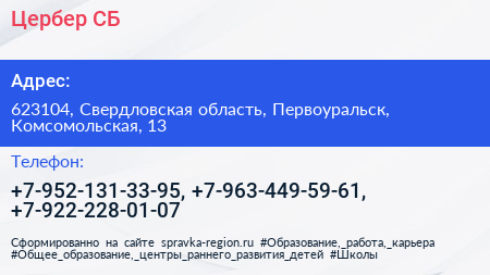 Цербер СБ по адресу 623104, Свердловская область, Первоуральск, Комсомольская, 13 в дальнейшем Организация, размещена в следующих категориях:
