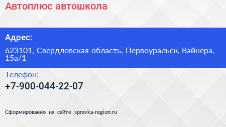 Автоплюс, автошкола по адресу 623101, Свердловская область, Первоуральск, Вайнера, 15а/1 в дальнейшем Организация, размещена в следующих категориях: