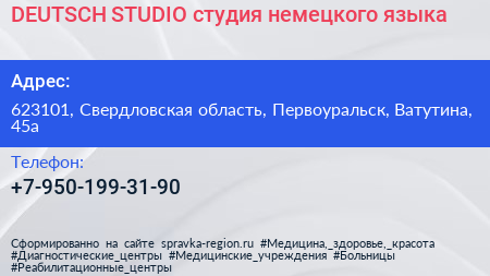 DEUTSCH STUDIO, студия немецкого языка по адресу 623101, Свердловская область, Первоуральск, Ватутина, 45а в дальнейшем Организация, размещена в следующих категориях: