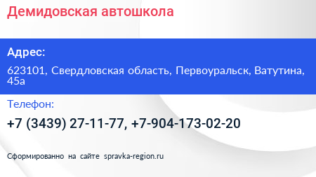 Демидовская, автошкола по адресу 623101, Свердловская область, Первоуральск, Ватутина, 45а в дальнейшем Организация, размещена в следующих категориях: