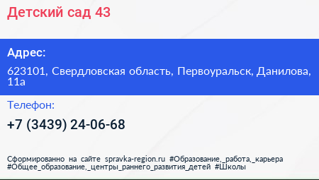 Детский сад №43 по адресу 623101, Свердловская область, Первоуральск, Данилова, 11а в дальнейшем Организация, размещена в следующих категориях: