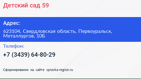 Детский сад №59 по адресу 623104, Свердловская область, Первоуральск, Металлургов, 10Б в дальнейшем Организация, размещена в следующих категориях: