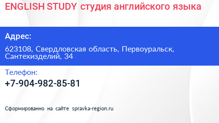 ENGLISH STUDY, студия английского языка по адресу 623108, Свердловская область, Первоуральск, Сантехизделий, 34 в дальнейшем Организация, размещена в следующих категориях: