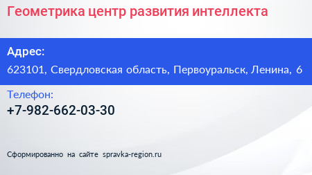Геометрика, центр развития интеллекта по адресу 623101, Свердловская область, Первоуральск, Ленина, 6 в дальнейшем Организация, размещена в следующих категориях: