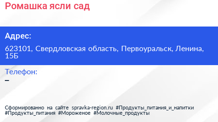 Ромашка, ясли-сад по адресу 623101, Свердловская область, Первоуральск, Ленина, 15Б в дальнейшем Организация, размещена в следующих категориях: