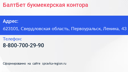 БалтБет, букмекерская контора по адресу 623101, Свердловская область, Первоуральск, Ленина, 43 в дальнейшем Организация, размещена в следующих категориях: