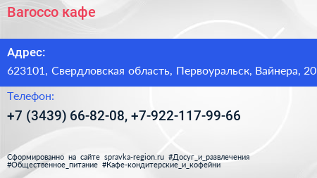 Barocco, кафе по адресу 623101, Свердловская область, Первоуральск, Вайнера, 20 в дальнейшем Организация, размещена в следующих категориях: