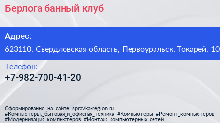 Берлога, банный клуб по адресу 623110, Свердловская область, Первоуральск, Токарей, 10 в дальнейшем Организация, размещена в следующих категориях: