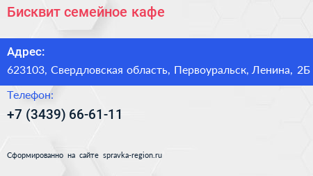 Бисквит, семейное кафе по адресу 623103, Свердловская область, Первоуральск, Ленина, 2Б в дальнейшем Организация, размещена в следующих категориях: