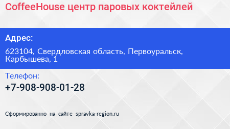 CoffeeHouse, центр паровых коктейлей по адресу 623104, Свердловская область, Первоуральск, Карбышева, 1 в дальнейшем Организация, размещена в следующих категориях: