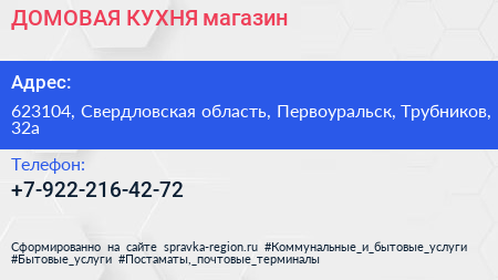 ДОМОВАЯ КУХНЯ, магазин по адресу 623104, Свердловская область, Первоуральск, Трубников, 32а в дальнейшем Организация, размещена в следующих категориях: