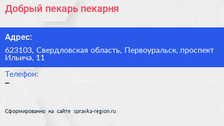 Добрый пекарь, пекарня по адресу 623103, Свердловская область, Первоуральск, проспект Ильича, 11 в дальнейшем Организация, размещена в следующих категориях:
